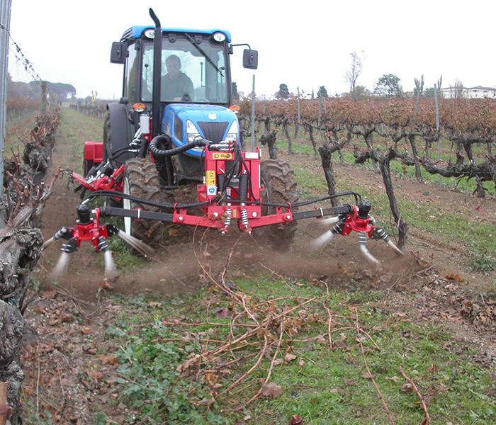 Barredoras frontales de restos de poda de viñedos y frutales. Ideadas para desplazar y acordonar las ramas resultantes de la poda en una línea compacta y así facilitar su recogida o triturado, simultáneamente, con un único pase de tractor.
