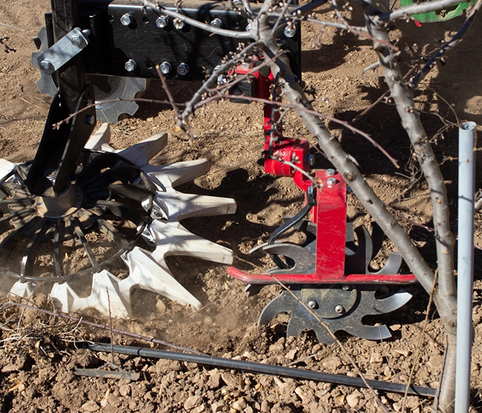 Chasis reversibles porta-escardador de dedos. Ideal para el mantenimiento y eliminación de malas hierbas de pequeño porte entre las plantas que forman las hileras.