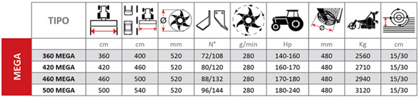Construida con un ancho de trabajo desde 360 hasta 500 cm, potencia exigida desde 140 hasta 240 HP y profundidad de trabajo desde 15 hasta 30 cm. La gama ROTOSTONE MEGA es constituida por enterradoras plegables para medias- grandes empresas agricolas. La utilización de materiales especiales y flexibles y el particular proyecto del chasis central han permitido de reducir el peso de la máquina conservando una calidad de alto nivel.