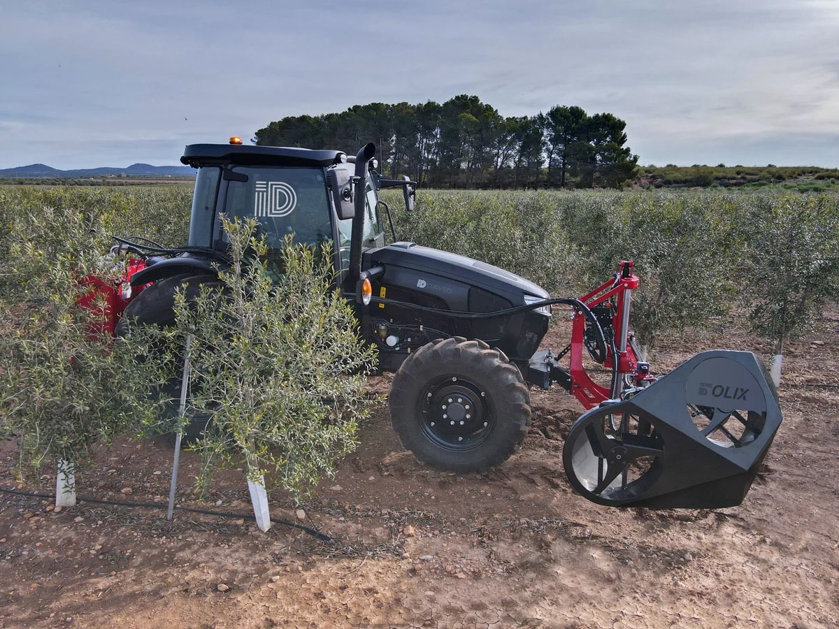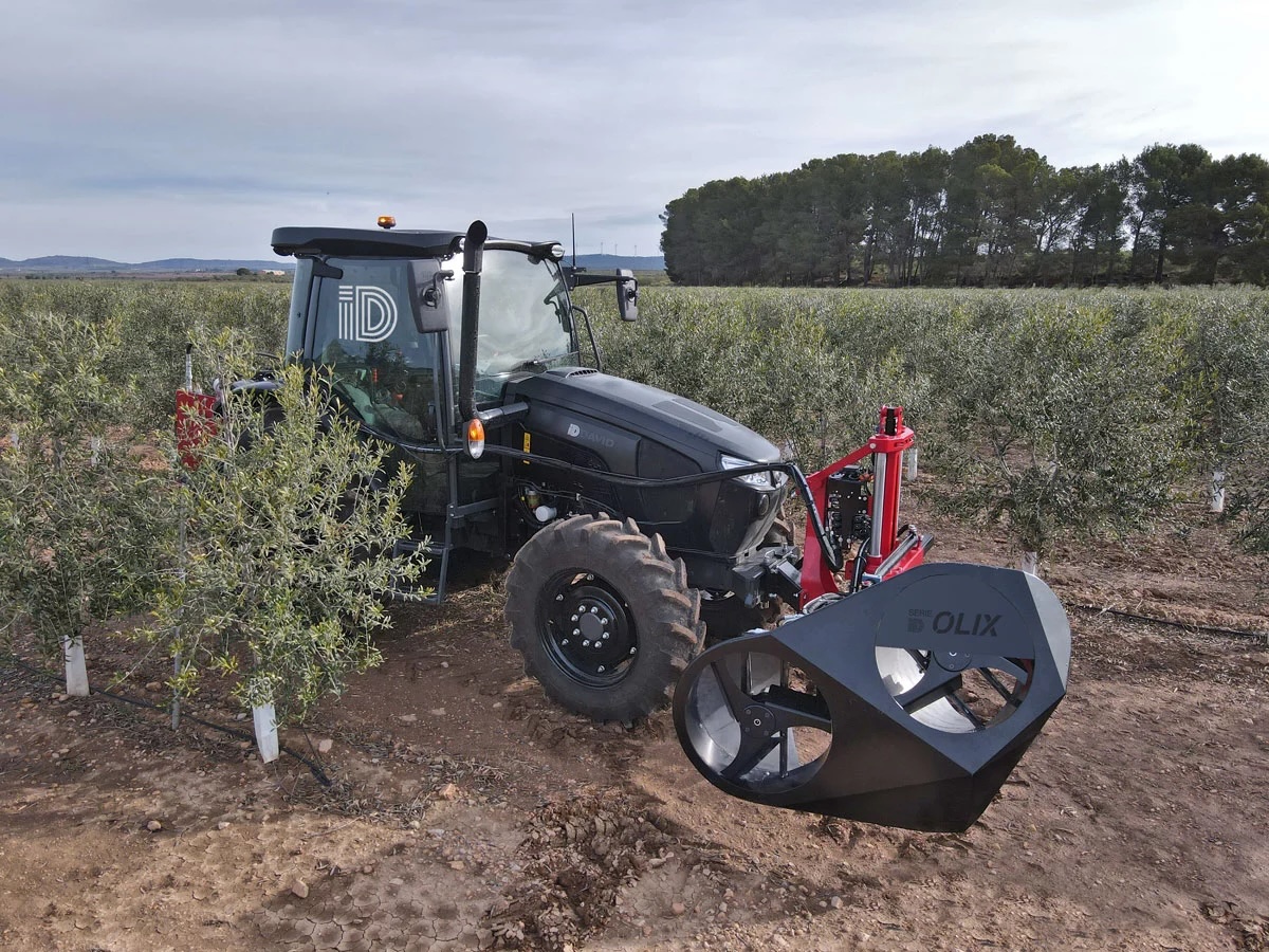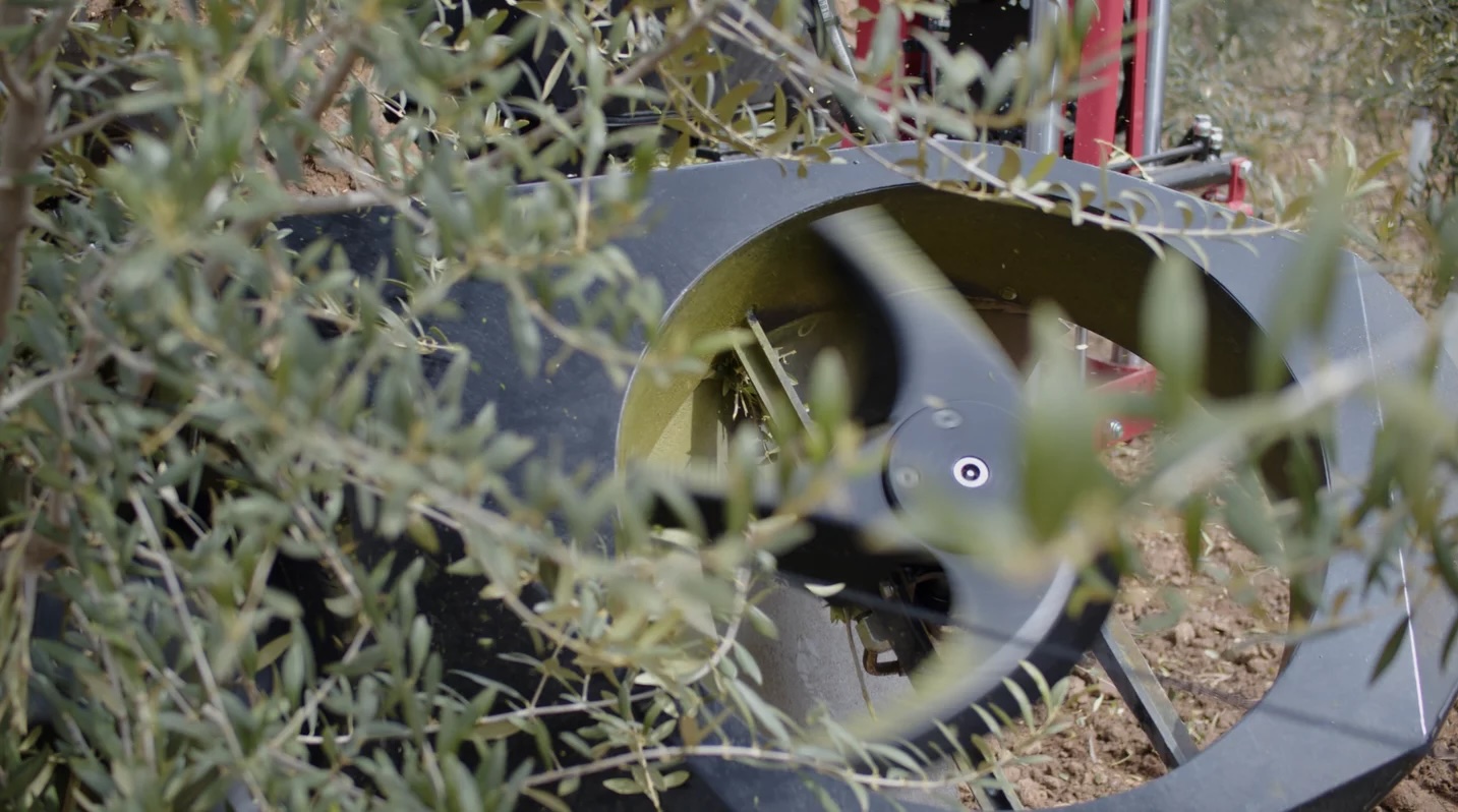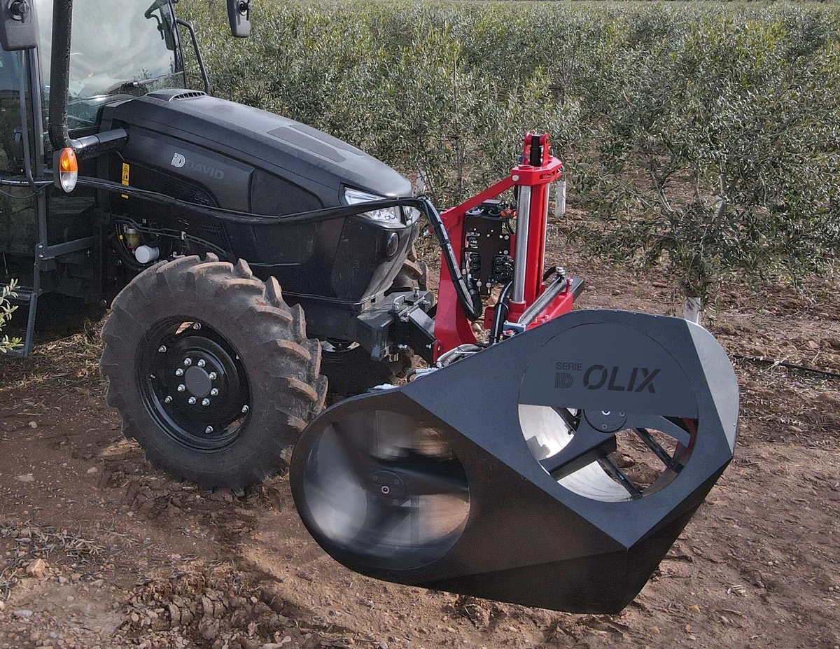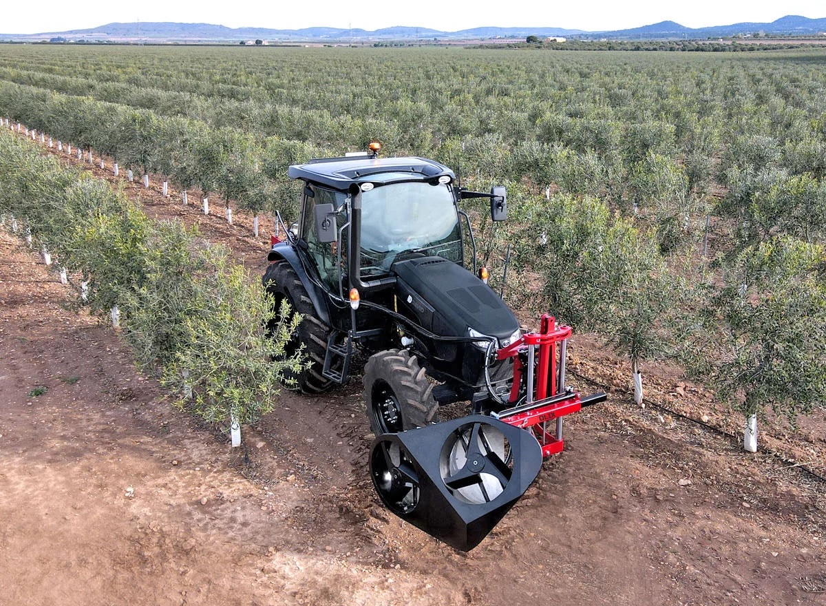 Podadora de bajos de olivar en seto. Podadora automática por absorción, de alto rendimiento para recortar las faldas de olivares super intensivos, evitar la pérdida de aceituna durante recolección y favorecer la aireación.