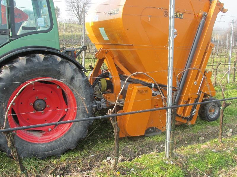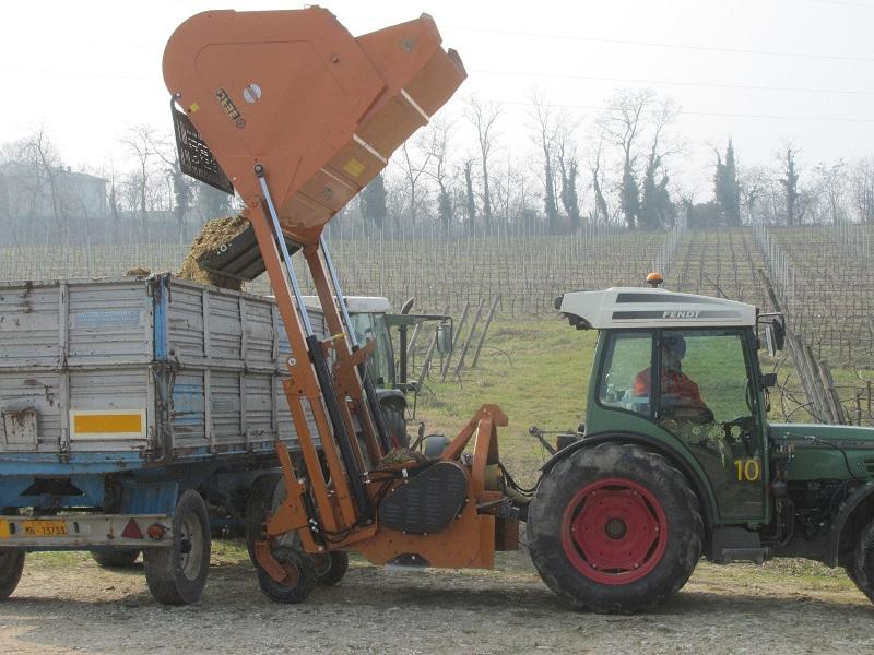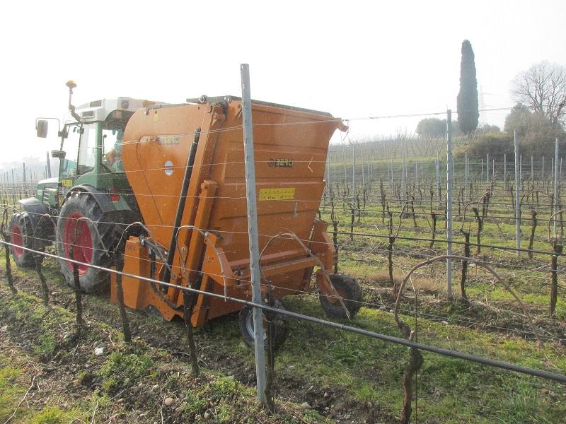 Desbrozadora Berti de picado en alto con rotor pick-up y contenedor patentado por BERTI. Indicada para la trituración de restos de poda y ramas (hasta 8 cm Ø) en olivares, viñedos y cultivos hortofrutícolas. Para tractores desde 60 hasta 140 CV. El material picado es recogido en el contenedor y no depositado en el suelo como en las desbrozadoras convencionales.