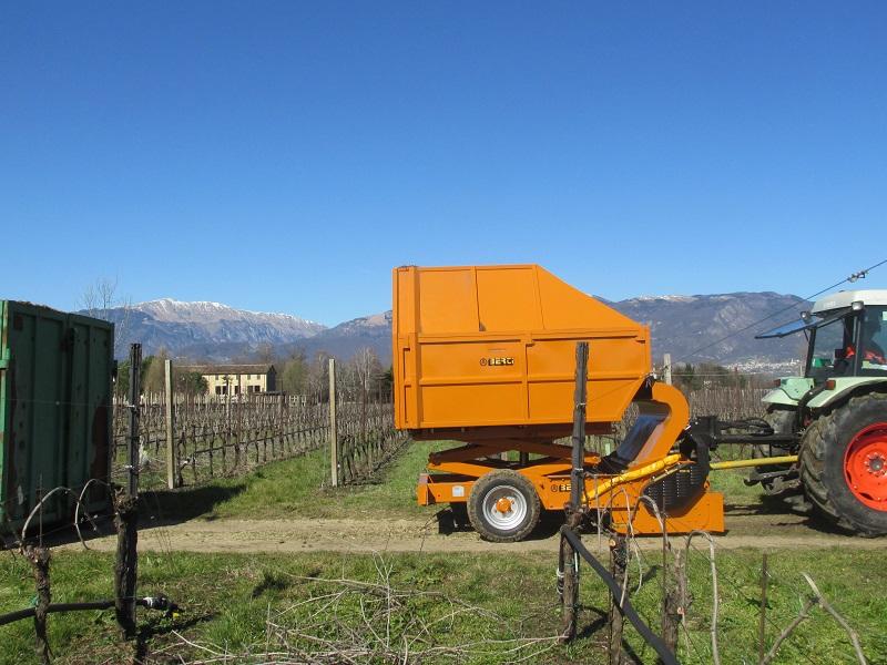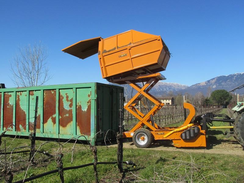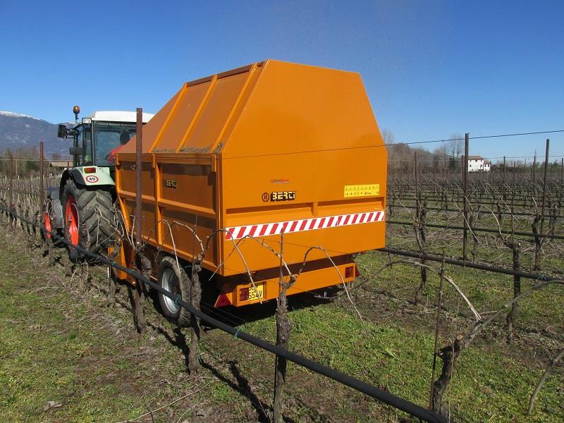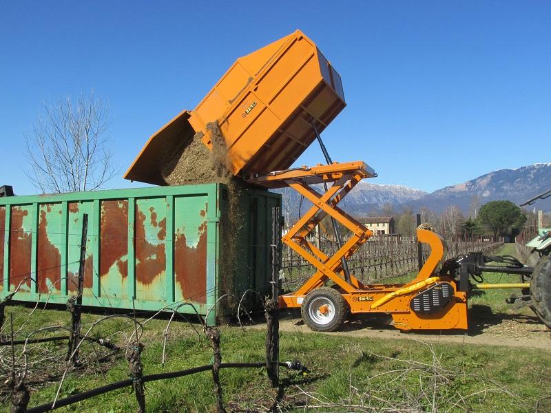 Trituradora Berti, de tipo remolcada, con rotor pick up y exclusivo contenedor-remolque para el triturado en sarmientos de huerto frutal, olivar y material leñoso hasta Ø 12 cm. Ideal para trabajar además en terrenos cultivados y/o pedregosos, de aplicar a tractores con potencia comprendida entre 90 y 140 CV. El material triturado es cargado en el propio contenedor sin liberarlo en el terreno.