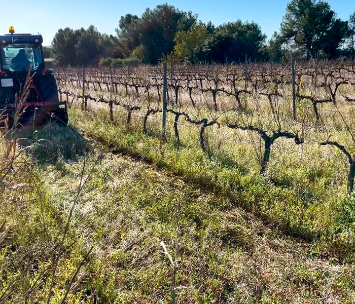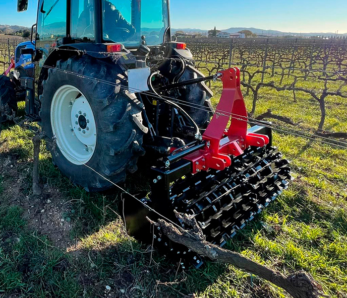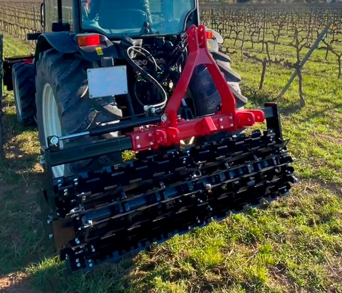 Rodillo triturador reversible. Ideal para doblar la cubierta vegetal mediante cuchillas, manteniendo la cubierta viva y permitiendo el rebrote en el punto de plegado, generando así un manto de materia orgánica.