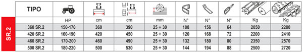 Serie pesada fija. Para tractores con potencia entre 150 y 220 HP. Ancho de trabajo de 360 a 500 cm. Estructura compacta combinable con rejas desmenuzadoras para eliminar la fase de arado. El rotobator modelo SR.2 representa una serie de equipos profesionales en versión rígida, dirigida a empresas de gran tamaño que desean optimizar la preparación del lecho de siembra en un solo paso. La disponibilidad de grandes anchos de trabajo, su alta versatilidad de uso y una extrema simplicidad de operación permiten reducir considerablemente los costos.