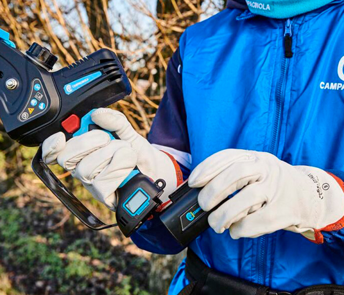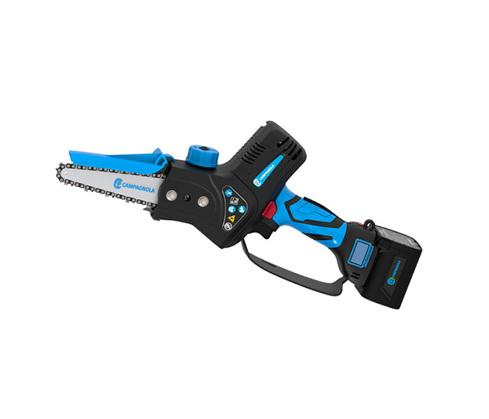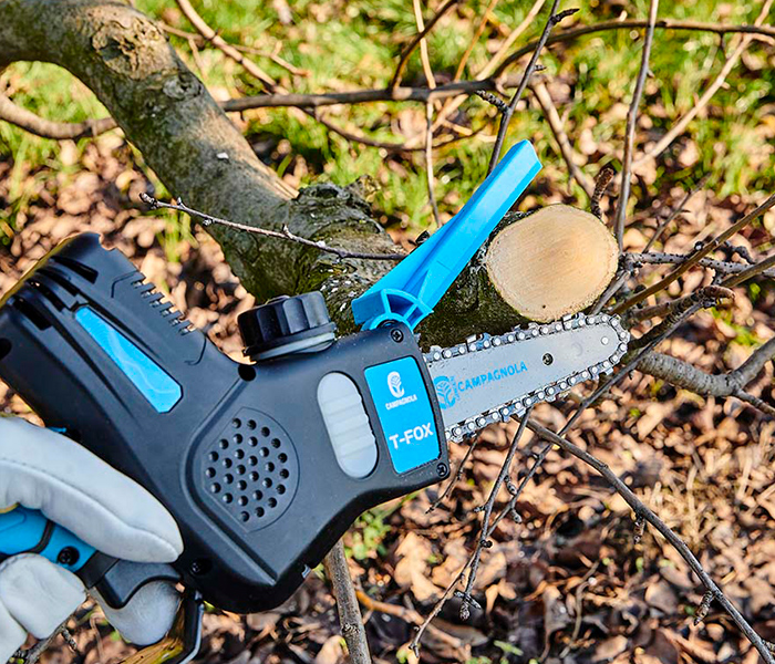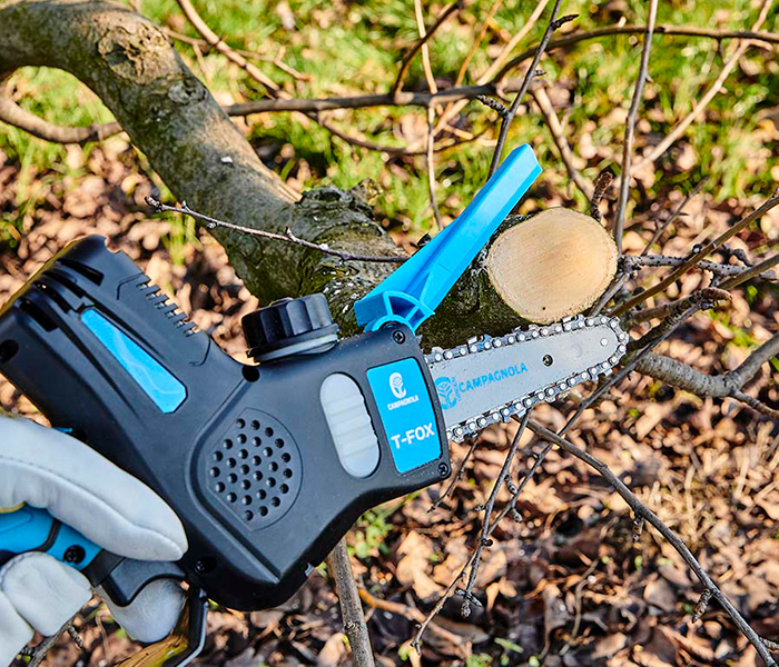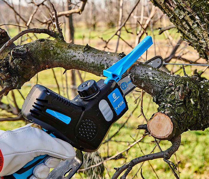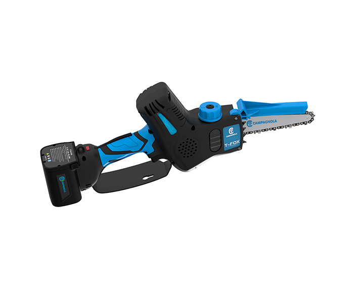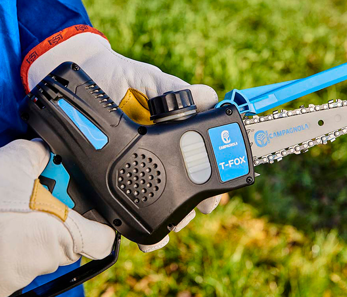 Su principal ventaja es la libertad de movimiento para el operario – gracias al bajo peso y a la batería incorporada -, que se combina con la notable potencia del producto, que permite realizar cortes rápidos y precisos. T-FOX también tiene un depósito del aceite transparente para la lubricación automática de la cadena, así como una pantalla LCD multifunción, que le permite ver el porcentaje de carga de la batería y las horas de trabajo.